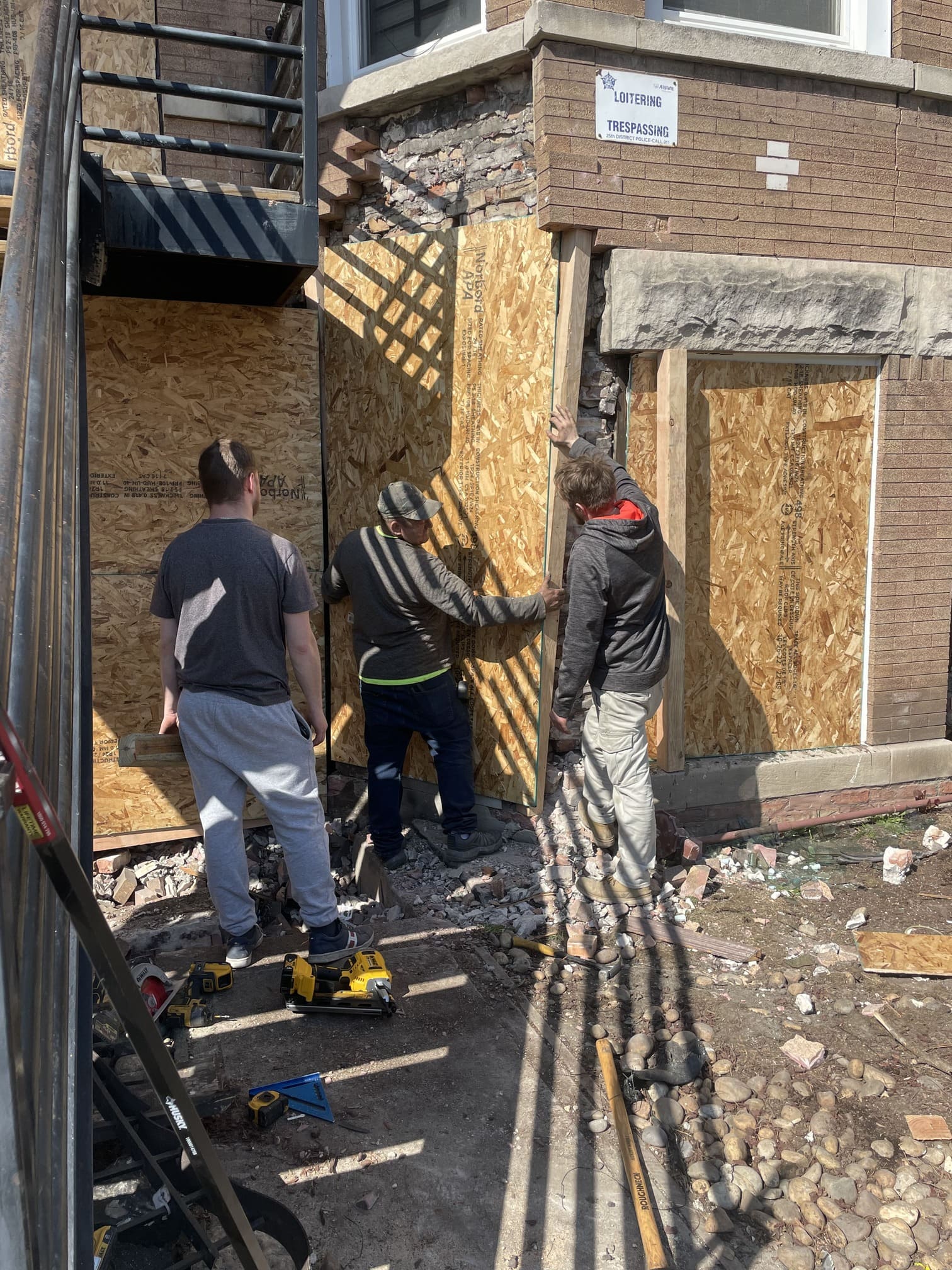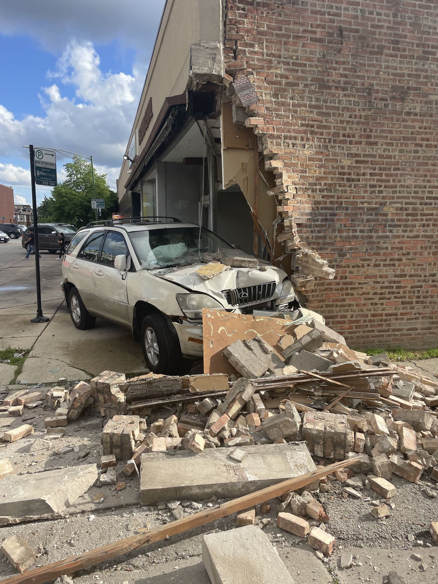 A car being chased by police crashed through a three-layer brick wall, tore down an iron fence, and landed inside a living room, leaving behind severe structural damage. The impact compromised lintel beams, collapsed part of the facade, and required immediate emergency shoring and a sidewalk canopy to protect pedestrians.
